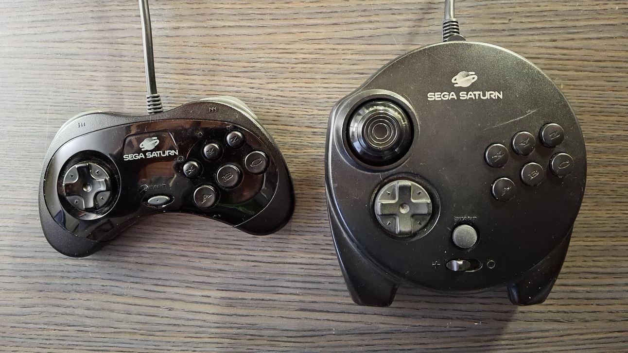 The Saturn has 2 regular controllers with different button layout design depending on which console model you have and the other one are 3D analog controller which features 3D analog stick.